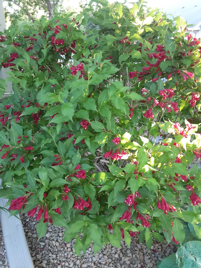 Our weigelia, one the other hand, is an old favorite. When the landscapers put it in the initial plantings, I was delighted. I like the color and how it seems to draw the hummingbirds – to the blooms, and to the feeder. Already this year I have also seen bees on its blooms.
