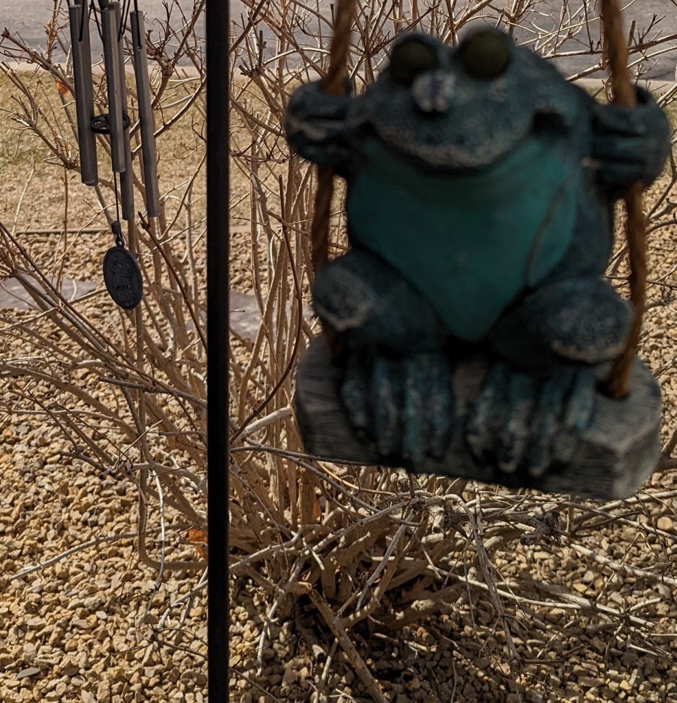 Up next in the spring garden work is the swap out of seasonal items in the gardens. Since we are getting new roofs at the townhome this year, and the schedule is very much tbd, I will not be putting out many garden decorations there. Things that are sturdy, things I can pull back inside easily will be it. The frogs playing checkers have already found a home. The concrete welcome frog stays inside this year. So that only leaves the frog on the swing and a few little frogs. Good enough. For this year.
