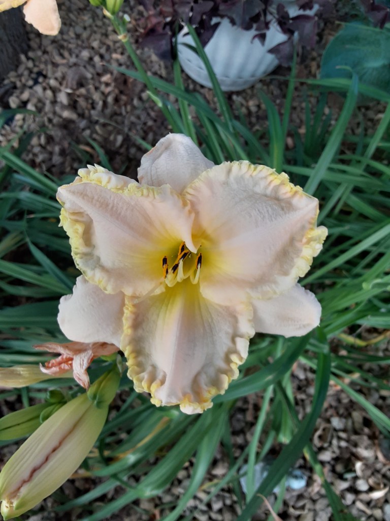 If I were to make a deliberate cross with two of my daylilies, I would aim for a cream colored predominance. I’m thinking a cross with Marque Moon. Marque Moon blooms late, so choices are limited with what I have. Maybe the Pink China Doll. Here’s last year for both Marque Moon and Pink China Doll.