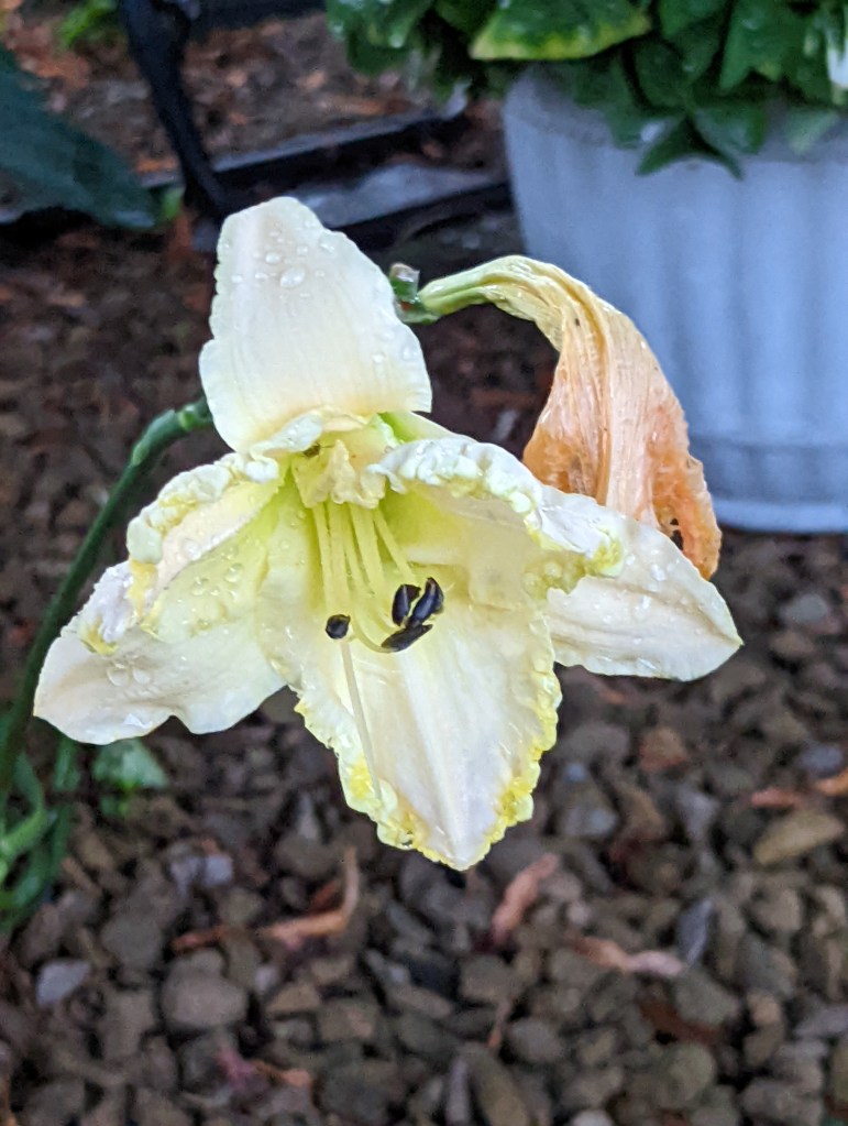 Today’s picture is an early morning picture of the second to last daylily bloom in our gardens this year – a beautiful Marque Moon. She sits next to a bloom from a couple days ago, which I do not remove, as it may produce a seed pod. If that happens, it would be the first Marque Moon seed pod of 2022. Some years are like that. You never know.