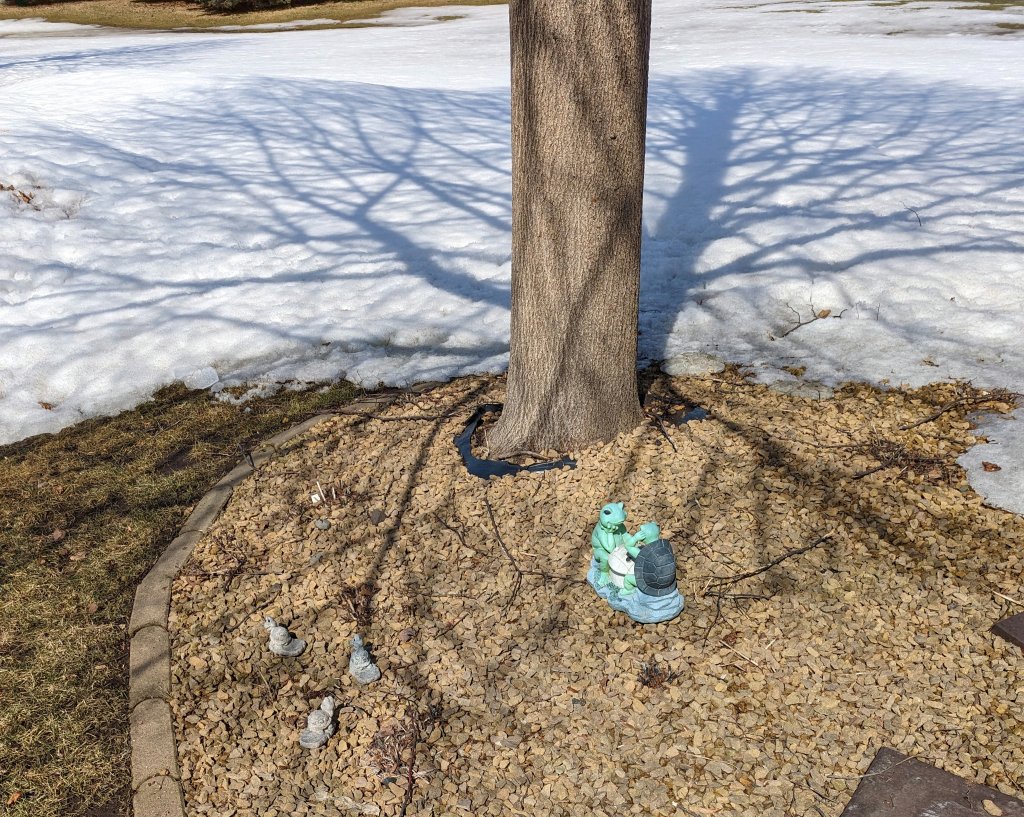 I particularly like this picture because it shows the shadow of the linden in the snow and exactly how beautiful it’s branches are. And of course a few cute little decorations in the rock have been put out today.