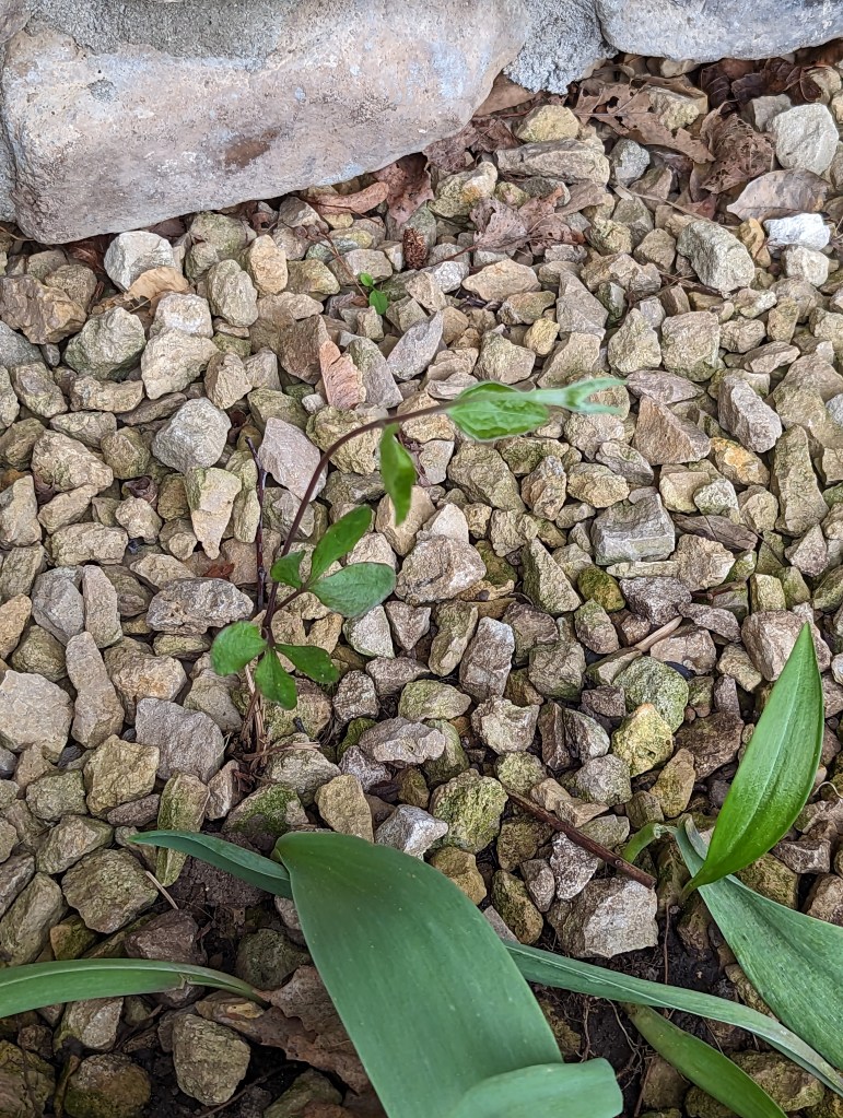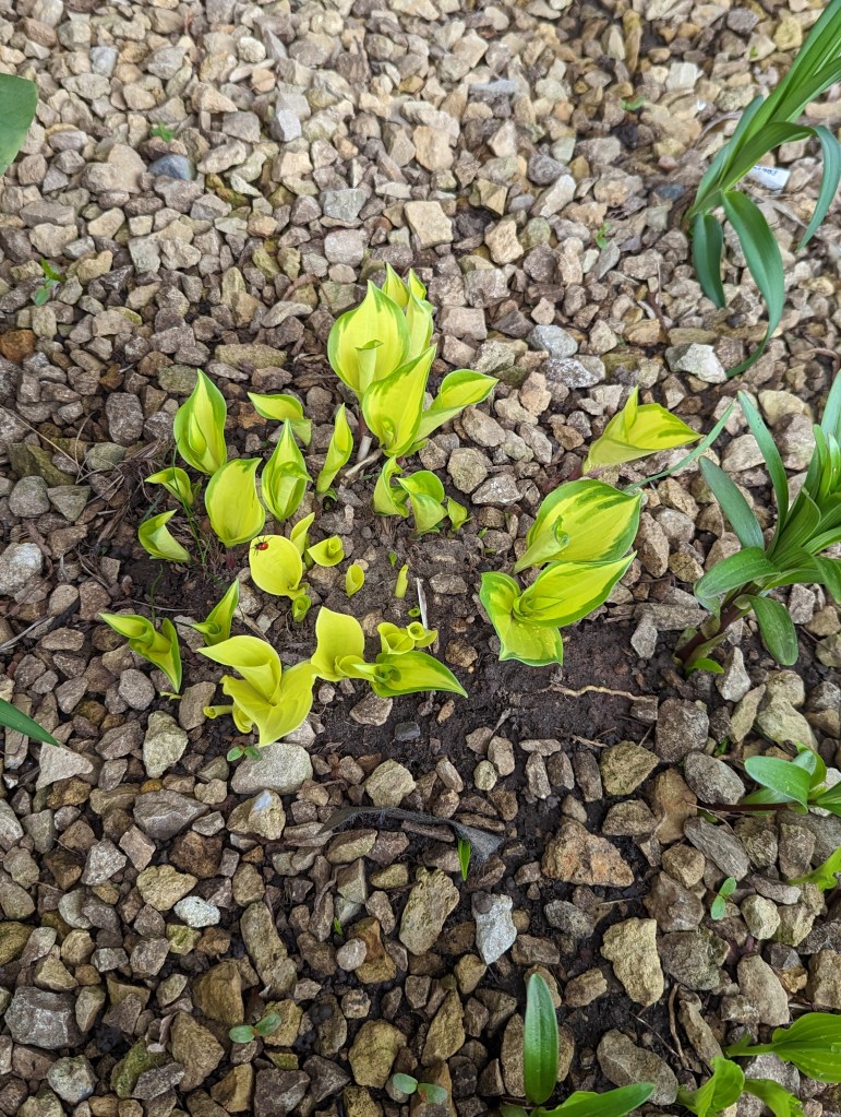Sometimes, a “kid” comes home after a short stint in another garden. This beauty coming up is a Rainforest Sunrise hosta. One of my absolute favorites. Back when we thought we were going to ultimately move to the little house up north, I dug her up out of one of the townhouse garden areas and brought her up there. At first she seemed good, then “ok”, but when we sold that house, she needed to rebound. The no-see-um bugs were eating her foliage, and she was covered with ants. We dug her out, cleaned her up, and brought her back home, to the townhouse, to hang out again with all her peeps and shine.