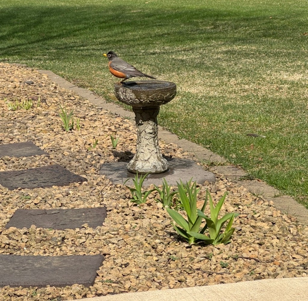 I wrote a detailed blog today – and deleted it. Much more fun to share that Sandy’s Corner is continuing to be a very enjoyable place to look out over that portion of the daylilies and daylily seedlings as the continue on their Spring growth. That I am hoping for more first-time blooms from seedlings again this year. That I am looking forward to more blooms from our prior years’ seedlings turned daylilies. And that the robins were very trusting this morning.
