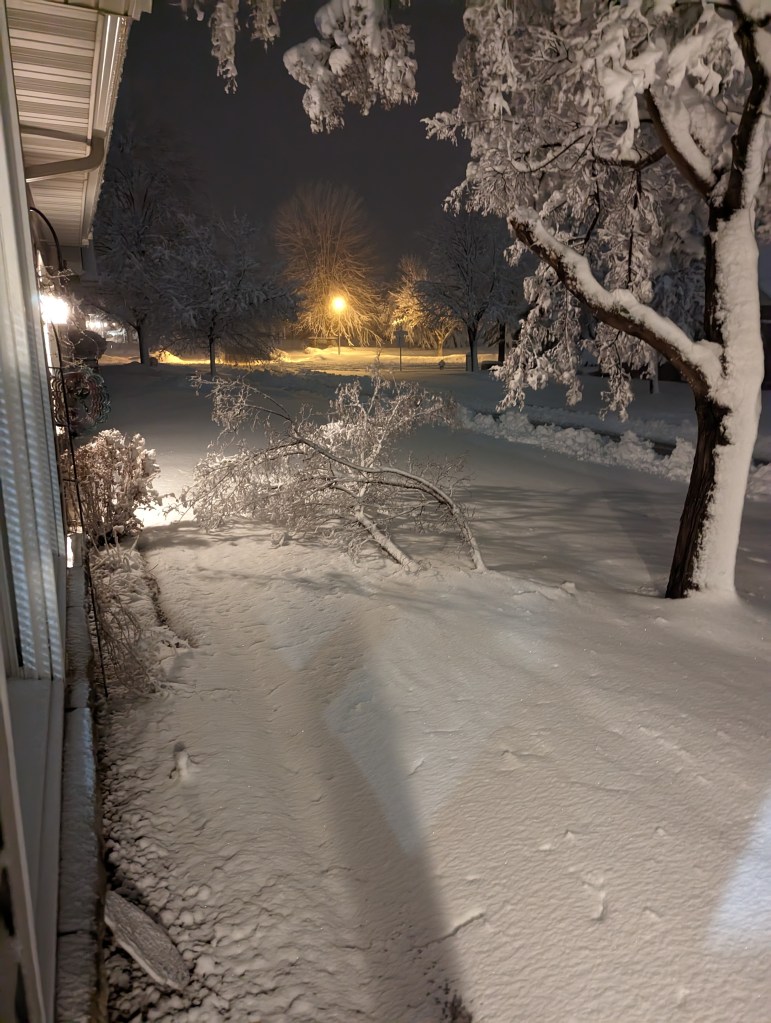 We had a big snow storm come through last night with very heavy snow. I was up late and actually heard the branch on the bottom go. Thinking it is a 50/50 chance the other damage snaps back. We shall see.