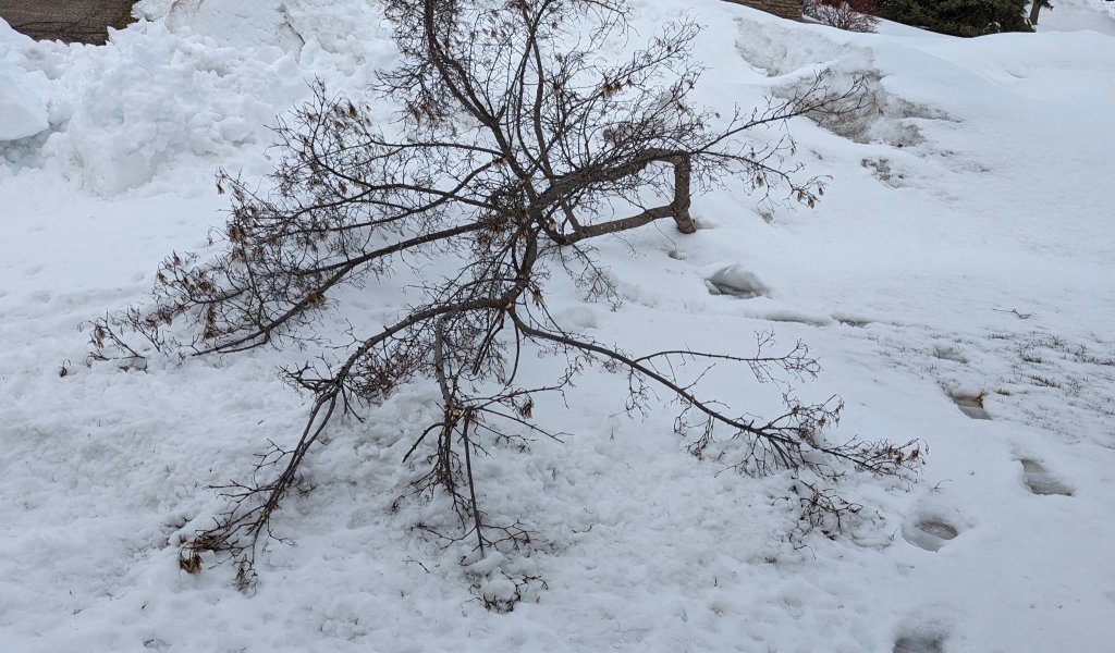 The amur maple out front was heavily damaged in Friday night’s ice and snow storm. In addition to the large limb that fully broke off, another large limb twisted and cracked lengthwise and is now just hanging there. It looks so sad 😔