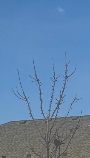 On April 1, 2023, we lost our Amur maple due to irreparable damage from a heavy snowstorm. I was sad. But there was no saving it. The tree was removed, and the stump was ground out. Later that season a small red maple was planted to replace it. I was, admittedly, astonished at how small it was. But it has survived two winters and this morning we realized the cardinals now approve. (The robins must have set the way 😉)