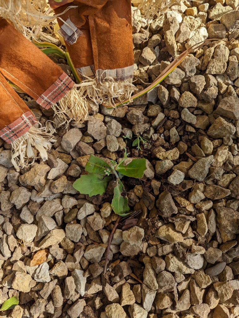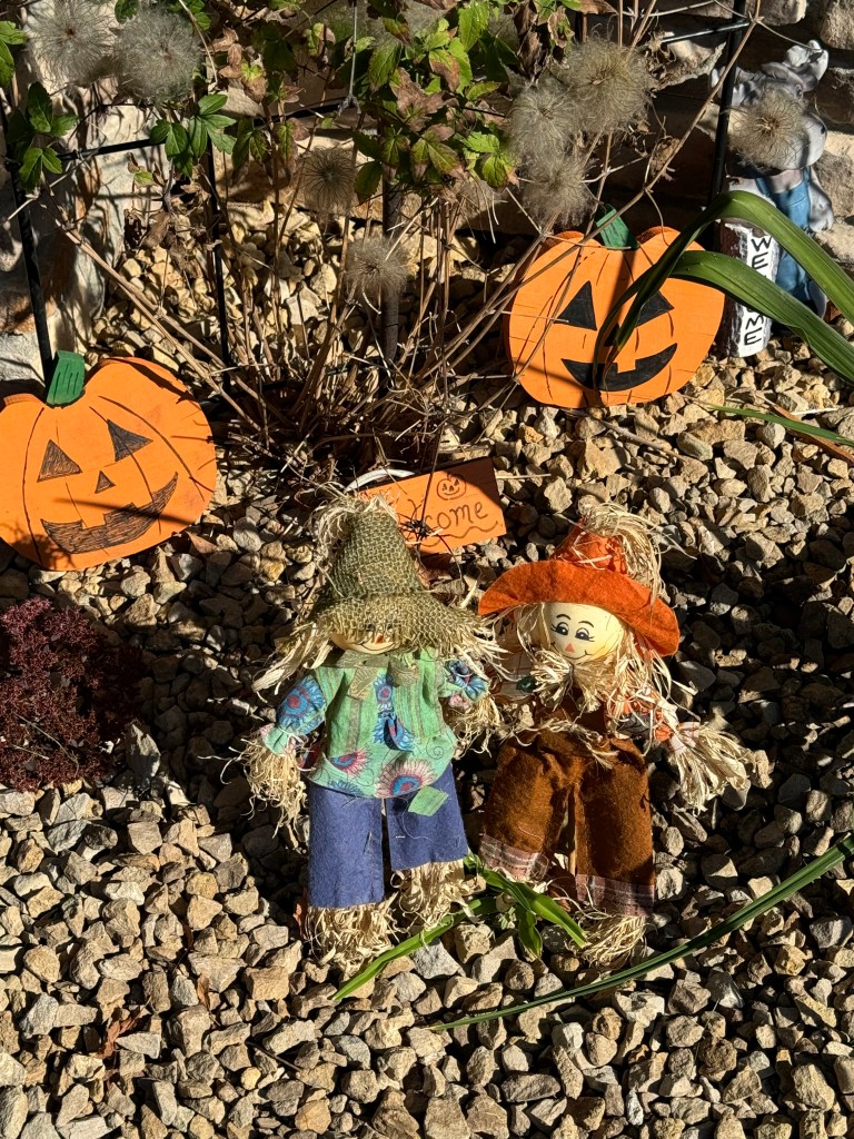 At the townhome gardens, the garden is starting to look more like fall. I decided the little scarecrows would be fun to be put out again this year. I almost feel like they could use some little hay bales. But I don’t do hay (achoo!!!) so … Blue Mouse Ears will have to do.