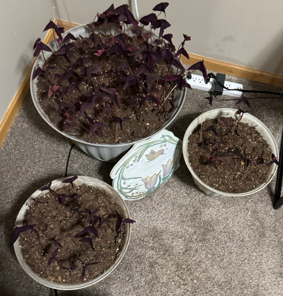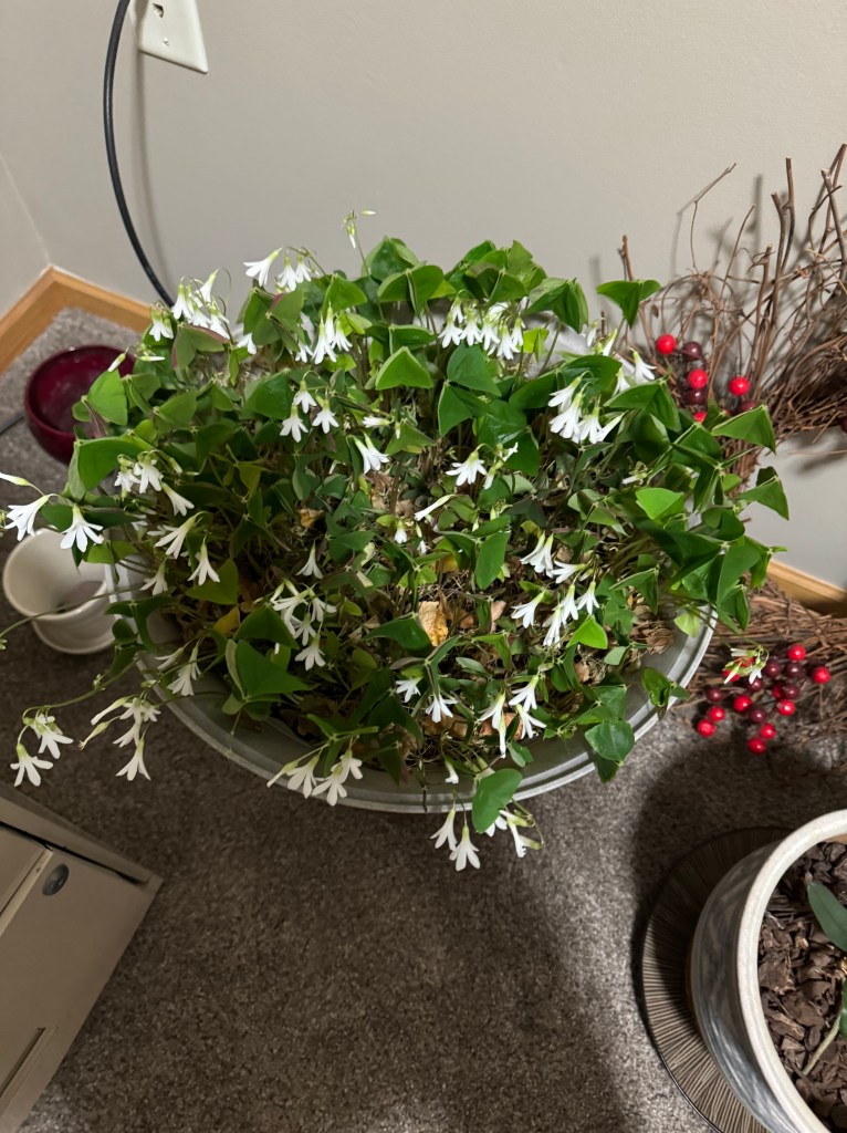The purple shamrocks I divided and I thought I killed – nope. Back in full force. And the green shamrocks I thought I accidentally froze out and was going to divide like the purple shamrocks – back in full force. Tonight the shamrocks rest but tomorrow they will be back open. I am also going to try to get the orchid to bloom. Fingers crossed.