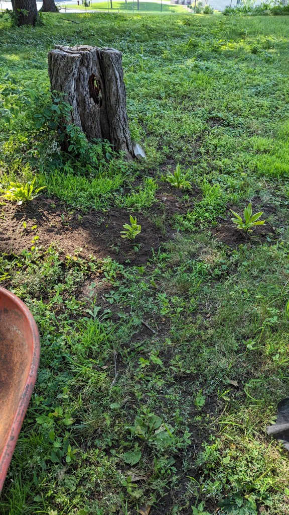 Since starting to swap out the old landscape rock for mulch at the historic cemetary, we have had the fortune of lots of gifting. Kind of like, “If you build it, they will come”. And come they did. When mulch went in, plants would appear. Not sure from whom – more of an anonymous donor thing. Most of the plants are sun loving … except … the hostas. Those poor hostas are burning, and making me sad, and so I decided to begin a plop swap. The donations are “plops” – they just appear, and they need a “swap” – to get them into the shade and get the sun loving plants that are in another shady garden into the sunny garden.