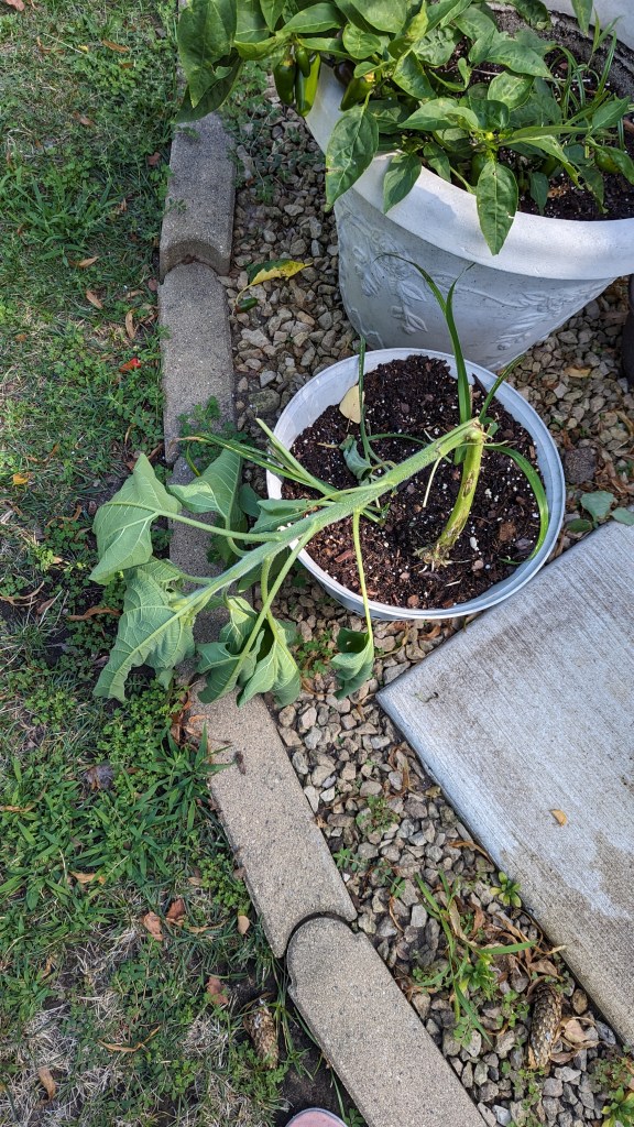 Sadly, we are thinking this was also the work of the bunny. Compost time. The daylily seedlings in that pot are ready to be planted so those will be a project in the next few days, along with the other potted daylily seedlings.