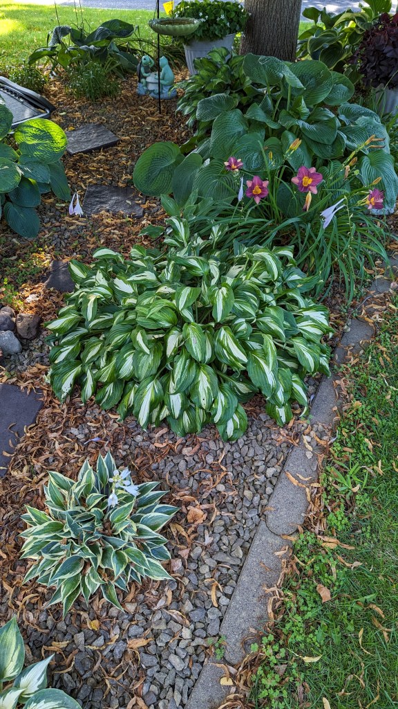 Many years ago when I started the townhouse gardens I was also helping my Dad with his gardens. After one of those gardening days, I was sweeping up from some transplanting. A few baby hosta corms were in the sweepings, and instead of tossing them, I brought them home and stuck them in one of our garden areas. My husband said he doubted they would grow. Well, he underestimated those little corms. Grow they did, and multiplied and were divided … And I bought more hostas then, other specialty types of hostas, like blue hostas varieties, which I fell in love with, and which, to this day I still have, and have divided and gifted – like to the gardens I made at the little house up north.