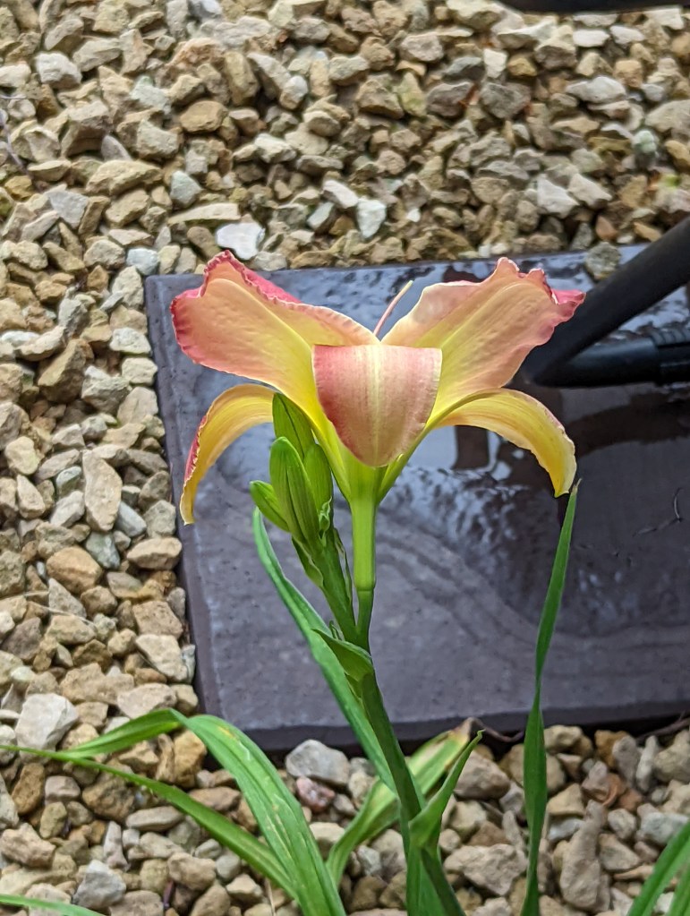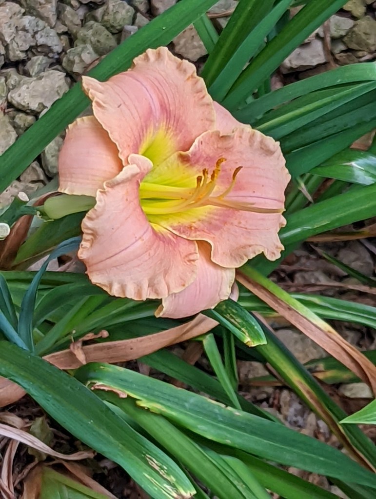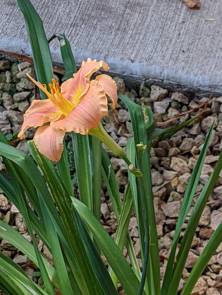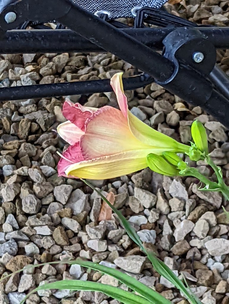 I have 7 daylilies that definitely need to move – the 4 out front that keep getting stomped on and 3 red ones that have been relatively safe all these years as they are up against the house. But this year they did not bloom. I think it is because we got a new, larger, grill, and they now have too much shade. Or they need to be divided. Either way, moving is planned. One of their offspring did bloom this year. It is a rooted offspring and very small. But beautiful.