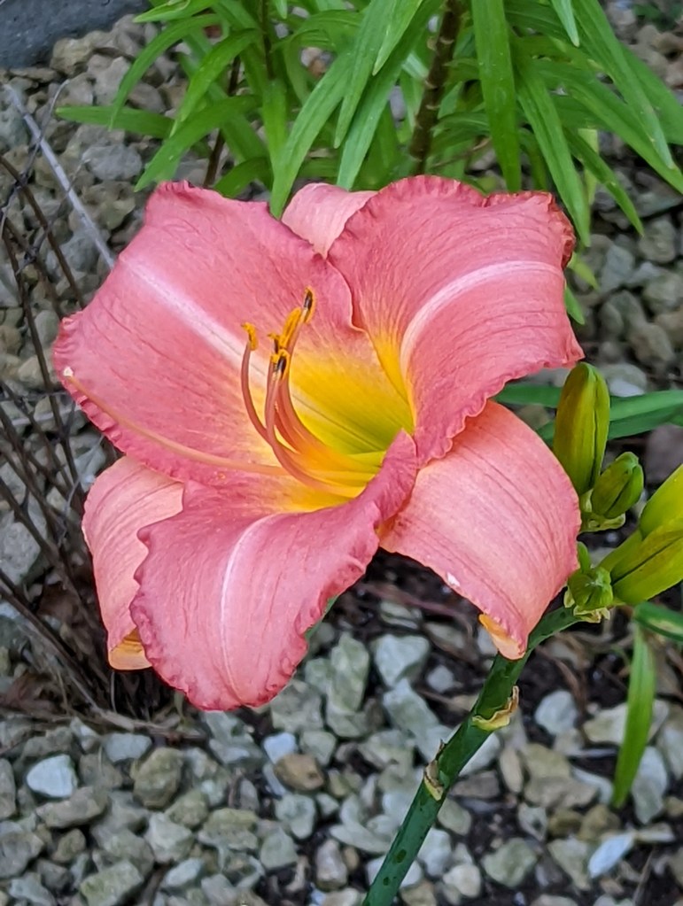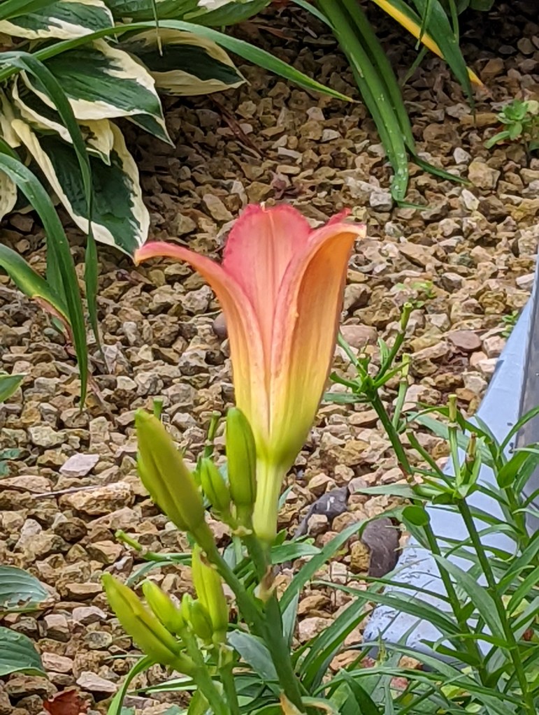 Finally, one of my dozen 2 year old daylilies also bloomed yesterday. I have to look up the name. For now it is Beautiful, Early Morning Tulip Shaped before it opens, Gorgeous Peachy Pink daylily.