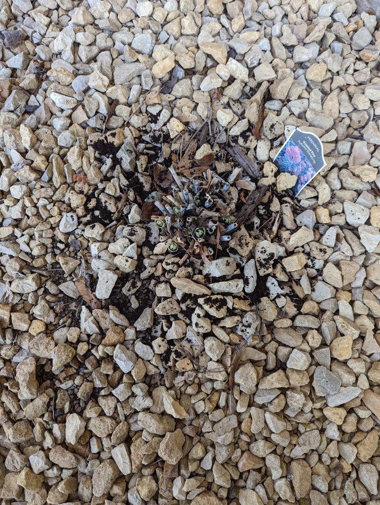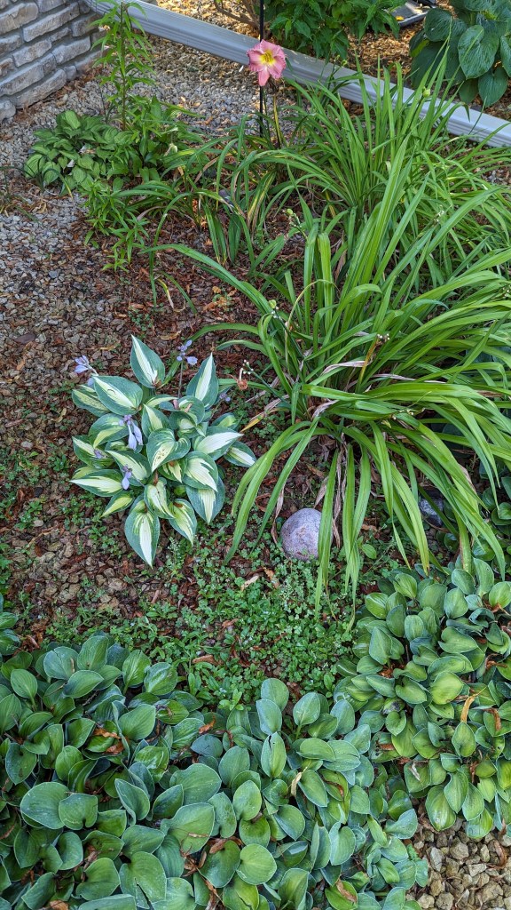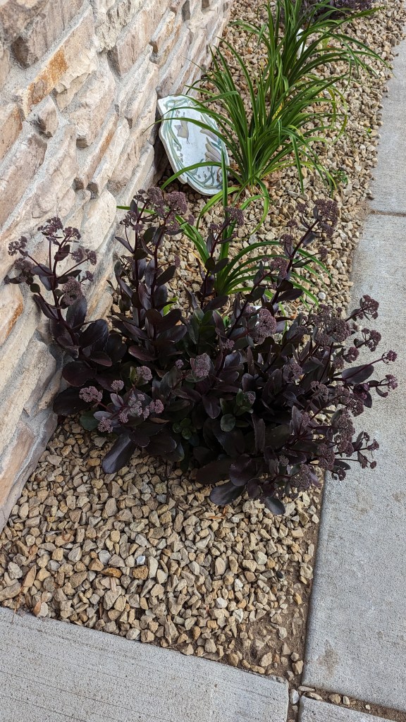At the townhome gardens, sadly, it looks like we lost two sedum. How that happened for one of them is a mystery to me. That one was our only variegated sedum, and I will miss it. It had been there for a long time, maybe over 10 years, so I am a bit surprised. I won’t replace it with another sedum, but I may put a daylily there this fall. Potentially a seedling. But first I want to refresh my memory on how strongly the sprinklers hit that area. I don’t think the variegated sedum died from sprinkler damage, but I want to make sure it is a safe place. The other sedum that didn’t come back was under the linden. That one never did well. It just never took off. I won’t put anything in that spot to replace it because the daylilies are also starting to underperform there. There are a lot of linden roots. It is a spot I will leave as “rock only” as things fail.