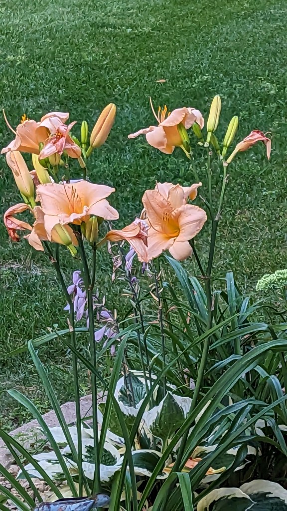 For the past few weeks the Asian lilies have been blooming, the remaining hostas have been scaping out, and every day I have seen more daylily scapes. The spots where we lost all the hostas have been reassigned to match our new phase of gardening here, clover has increasingly been removed, and bunny deterrents are in place.