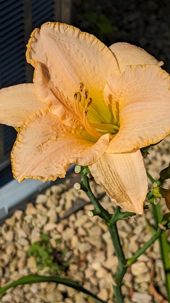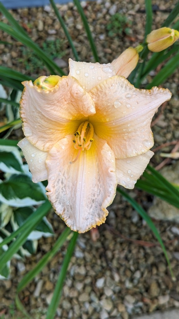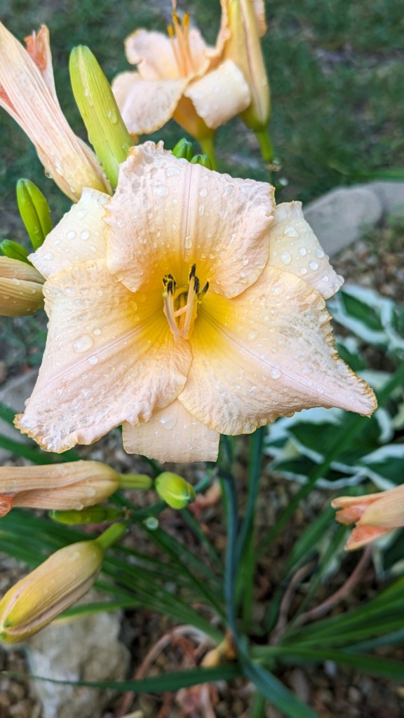 Which leads me to story time. When I started our gardens at the townhouse many many years ago, I was head over heels in love with hostas. I planted boatloads of different hostas. I visited hosta gardens. I bought “hosta of the year” varieties I liked. I was gifted hostas. My Dad even bought me hostas from a neighborhood gardener he called the “hosta masta” (master, that is 😊). I have grown and divided all kinds of hostas for over two decades. I even tried my hand at harvesting hosta seeds and seeing if I could grow hostas from seed. (Not for me.) I love hostas. And I will keep the hostas I have that are still doing well. But that era was that era, and the garden “container” is the garden “container” (not getting any larger), and I am not getting any younger. So … in a finite space garden … hosta attrition makes way for daylilies, if the space is sunny. (Amazingly, I did have some huge hostas that did very well in relatively sunny spots. Go figure). In this new era, I have my daylily seedling beds, and they are doing well. Those were solidified as the plan last fall. I also have one 6th year non-blooming daylily seedling in a different area, and I just can’t seem to move that one out, but we shan’t dwell on that. I figure at some point when the garden “container” is full, I will know it is time to stop doing daylily crosses, and then I will sit in my patio rocker, with a beverage of choice, and just enjoy. Haha, I can hear family and friends alike laughing uproariously. But that will be a few years yet. Hopefully quite a few. Because goodness! I have 60 “same cross”seeds I still need to get into pots in the seedling planter, and if even half of those go to seedling, oof! Realistically, experience tells me “probably not” and I will most likely end up with optimistically, 10 seedlings from that 60, to be planted in the 2025 seedling bed this fall, and watched for bloom starting next year.