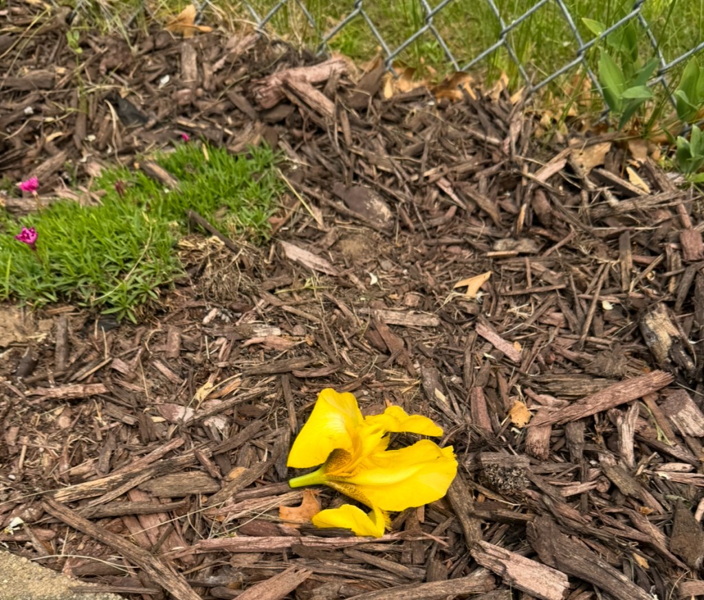 And one came up! But it was not meant to bloom there. You see, within the past day and a half someone/something came by and snapped off a bunch of yellow irises and the one purple iris. The yellow ones – in various stages from bud to bloom – they threw around in the mulch and even on the ground,