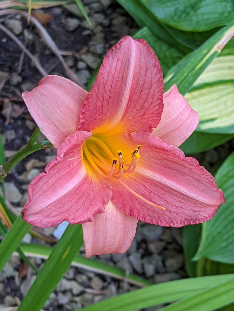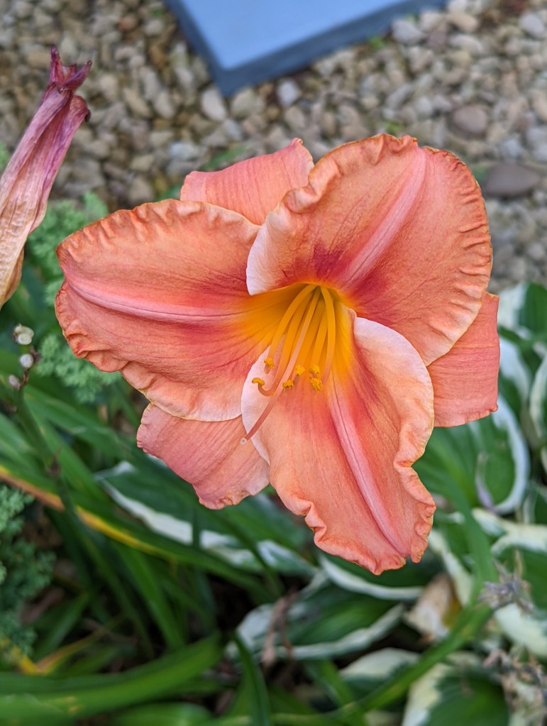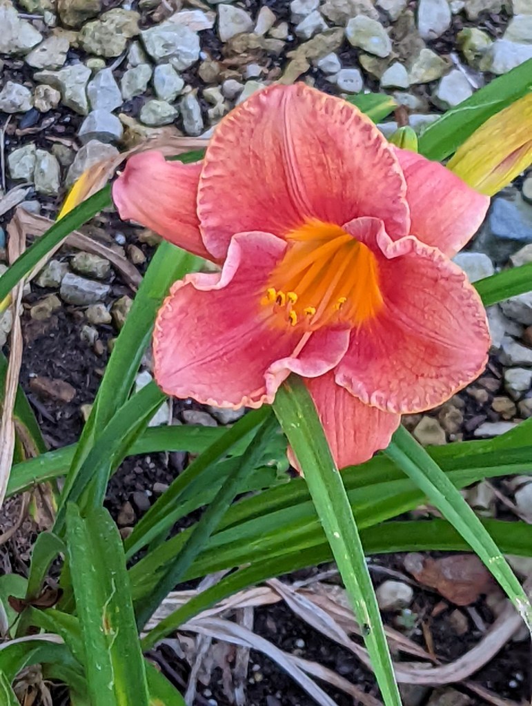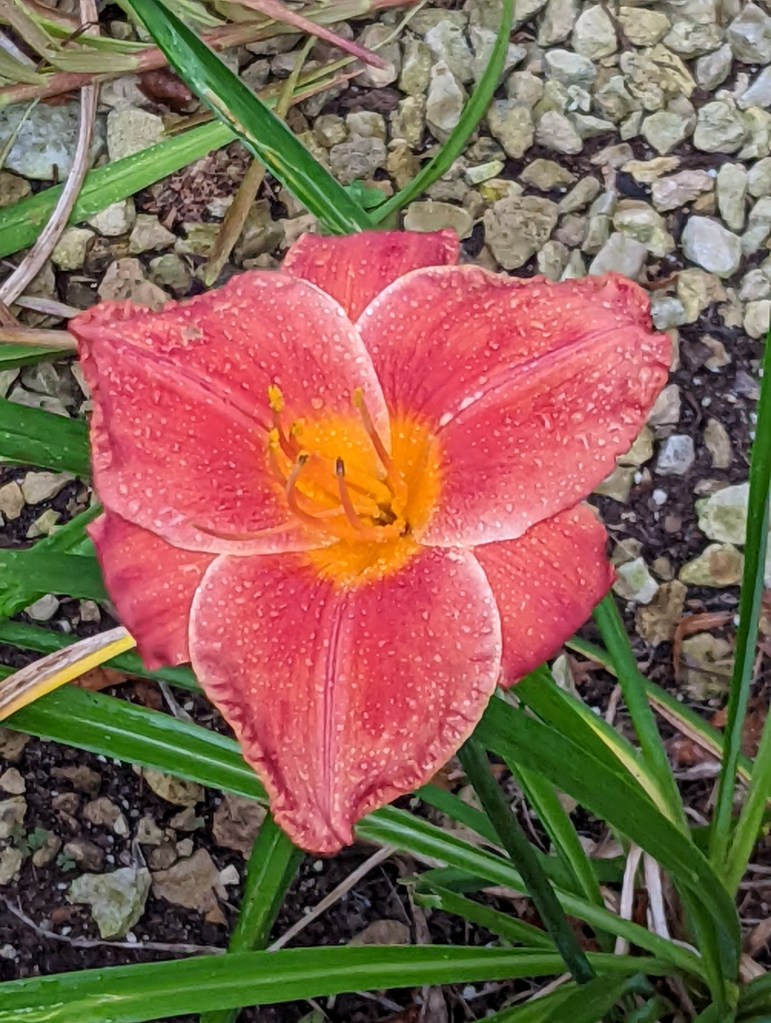 Coral Majority has been in our garden for a couple years, but just bloomed this year. It is a super interesting daylily. The first bloom stayed partially open all day. I liked it – just was surprised. The next bloom opened almost flat, but it took all day, and that day had a late rain.