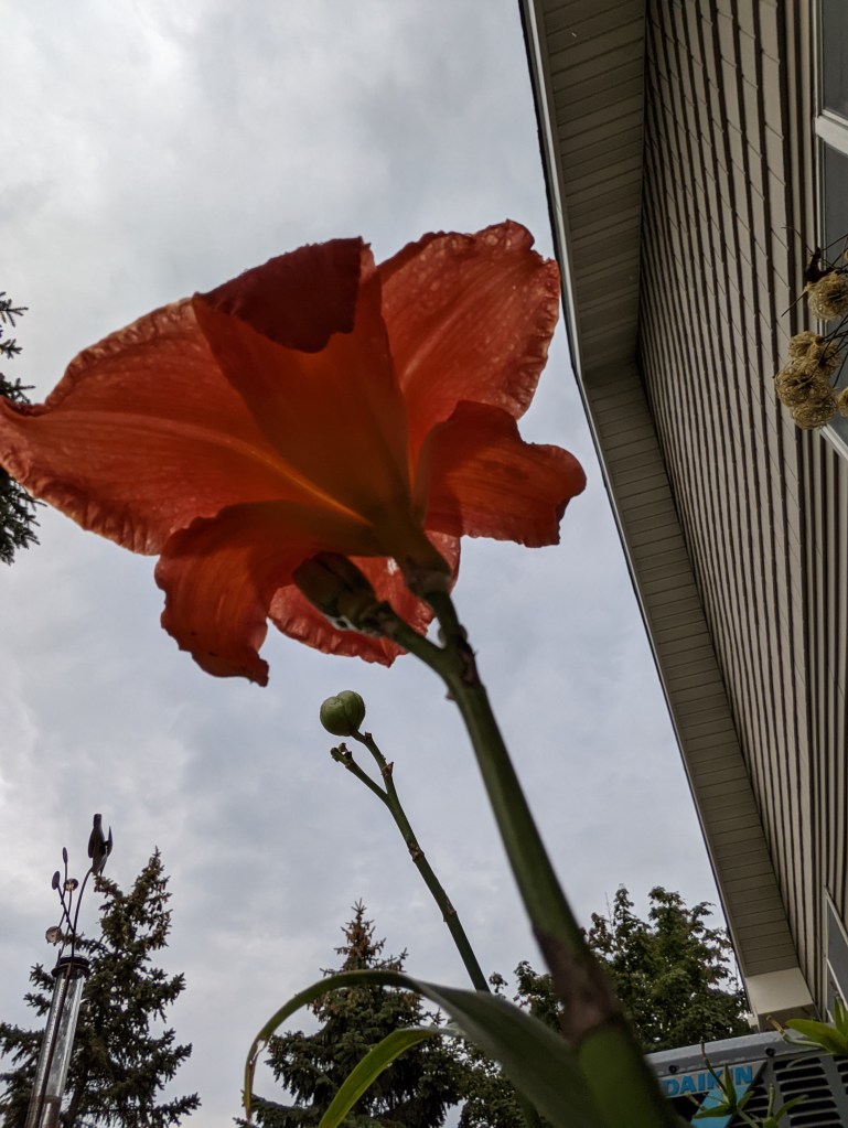 The “outside” of daylilies are as beautiful (to me) as the inside. When this bloom opened flat, the only way to capture the “outside” of it was up. And what a treat, to capture Cedar Waxwing’s seed pod in that process! I did not anticipate that 🙂