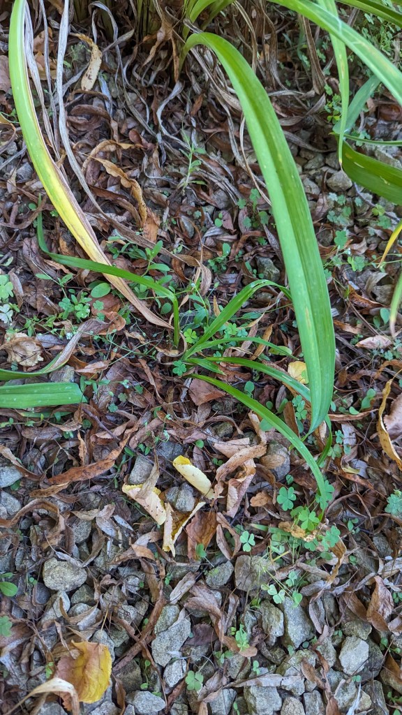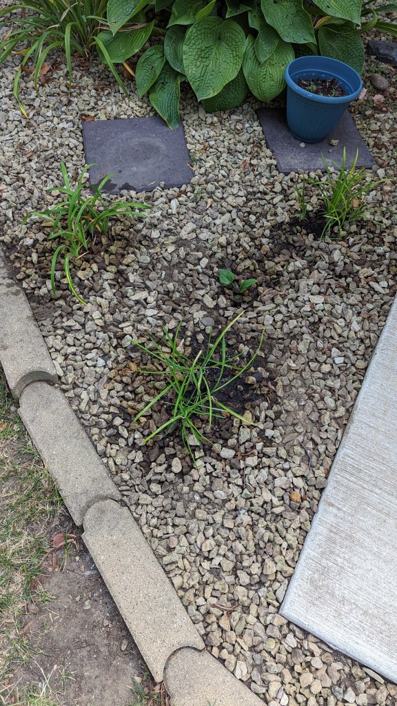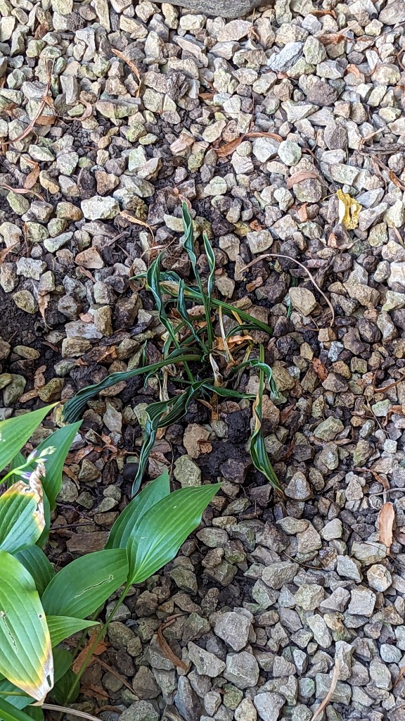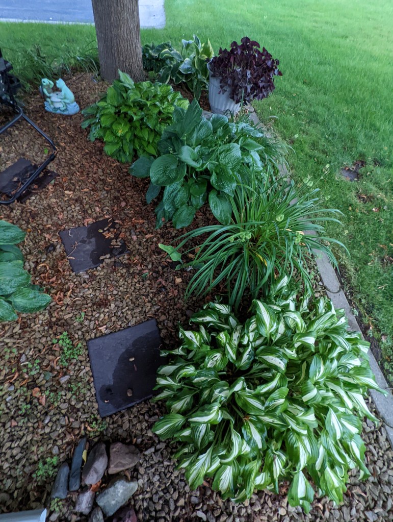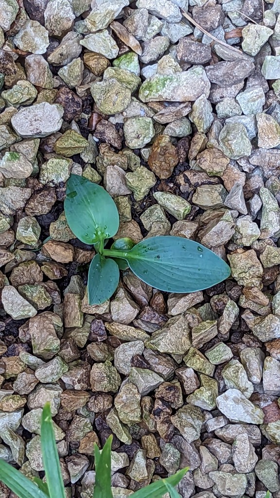 The new garden “look” includes continuing to transplant the Blue Mouse Ears hostas. I dug, divided, and transplanted a large clump of those hostas into their new spots, and I really like it. If there is time, I have one more clump of Blue Mouse Ears to move, but if I don’t, it can stay as is until next year. I also am seeing some purple shamrocks come up from this spring’s, shall we say, squirrel curiosity, ahem.