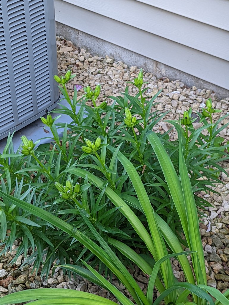 One of the Blue Mouse Ears hostas out back also got a little smooshed with the roofing project. That was ok because it needed to be divided anyway, and the flowers get hit by the sprinkler, so moving the whole plant is probably a good idea. Blue Mouse Ears are the perfect size for the entryway area, and with dappled sun due to the Amur Maple they will look great for years to come. That area also had the remnant of a Rainforest Sunrise hosta I mostly moved up north, but it got a bit smooshed too so this will not be it’s shining year. I had to cut away the smooshed leaves. No worries, it will pop back next year. But besides a center hosta and the few Blue Mouse Ears divisions, and the low growing sedum, what to put in that area for color? No to annuals I think. Daily watering – ugghhh. That is for bird baths – haha! No to sedum divisions – the two low growing sedum are enough. Asian lilies seem to die out there, and the stems are not great after bloom either. They require layering to cover those up. So it may be daylilies. I am concerned about the dappled sun, but maybe. Still contemplating.