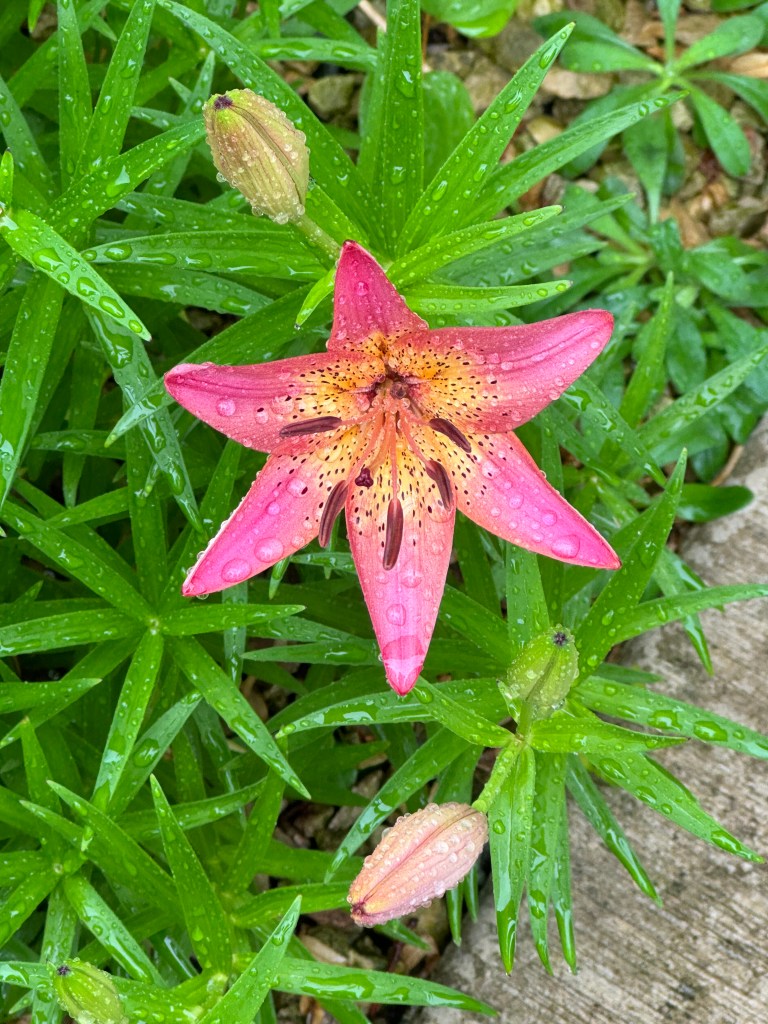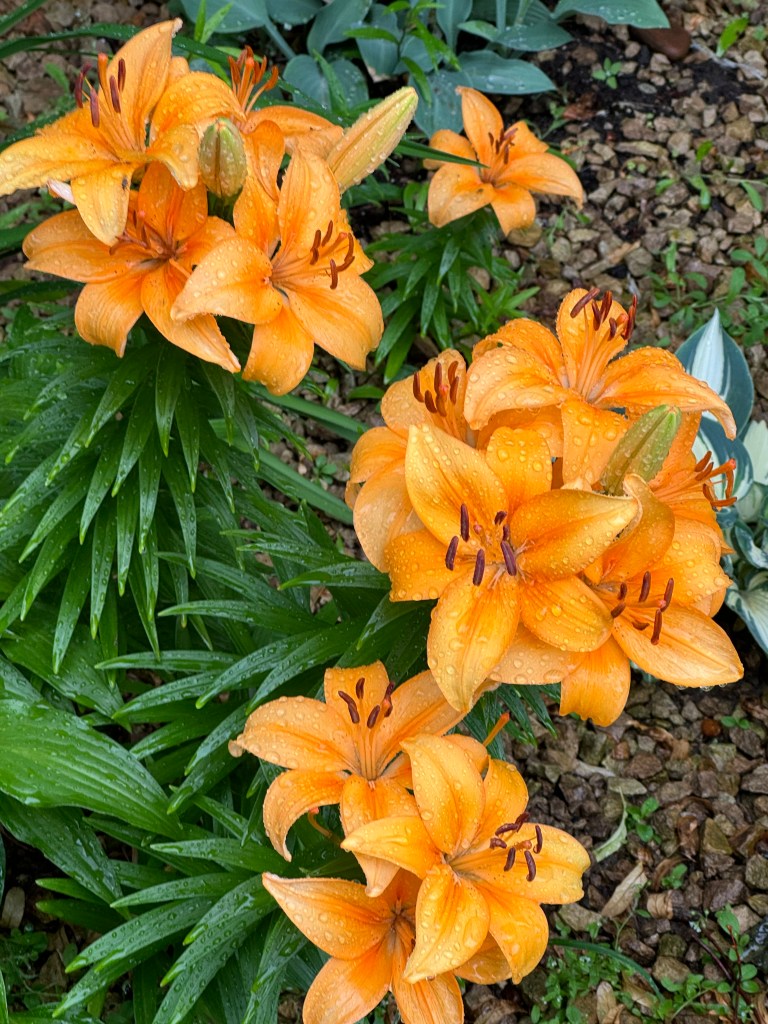 We are having an exceptionally rainy Spring this year, which, alternating with some recent heat spells is causing us to play hopscotch with our time in the gardens. Think mosquitos also added to rain and heat impediments. Short bursts of catch-it-while-you-can time has been the norm. But the Asian lilies are keeping it pretty, whether inside or out.