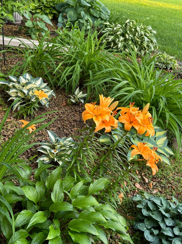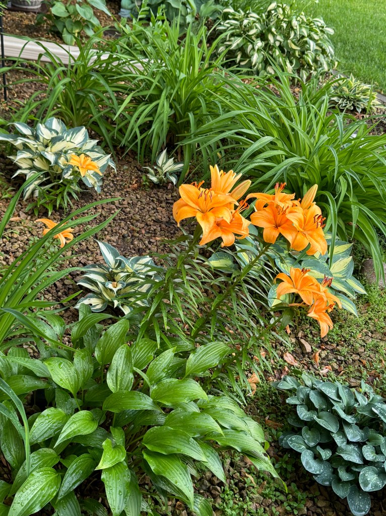 I added pink Asian lilies year three in another area in the back gardens, and those multiplied and divided and I started new groupings. Every year they come up in the same areas. Nice.