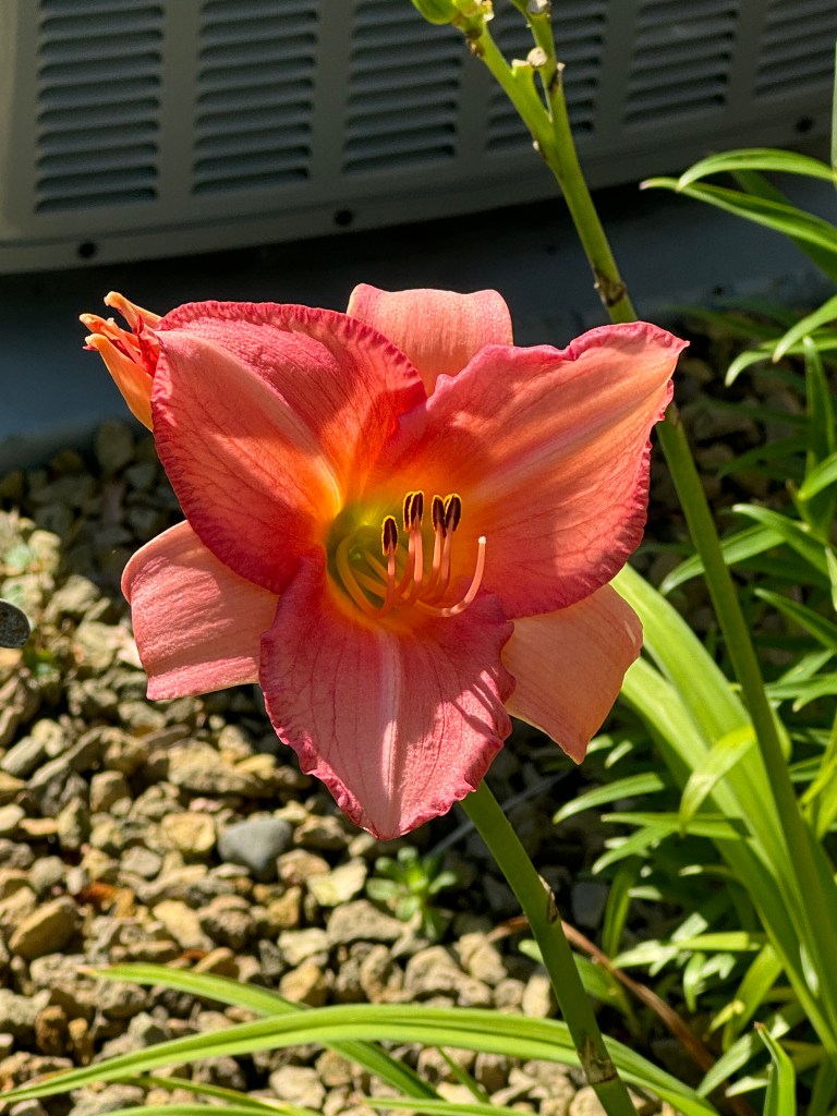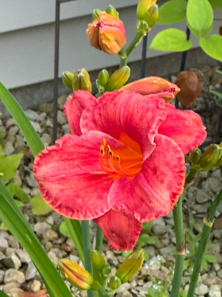 I don’t know … I can’t remember if I liked it last year. Maybe blooming next to Cedar Waxwing it has an unfair comparison. (I would take 10 Cedar Waxwings.) But I just am not “in love” with Coral Majority so far, 2 blooms in, this year. I should be. Its parentage includes South Seas, one of my faves, but I just don’t know. It is pretty, kind of like someone else’s cute baby, but it might not be “mine”. We shall see. Maybe if I cross it back with South Seas, or with Marque Moon …. Stop! Just stop! 🤪