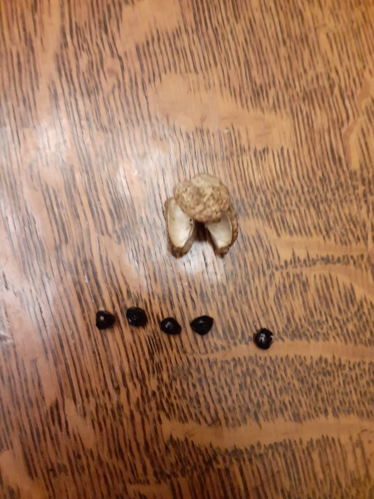 The daylily seed harvest is wrapping up. This year I have eight different types that survived the bunnies, squirrels, and sprinklers. Two are self seed and one is an “unknown” after a save from critter curiosity. That leaves five, and the daylily seedling box fits five pots, so, whew! we probably don’t need to put an addition on the daylily seedling “inn” next spring. After discovering what looks like a self seed, self plant, seedling bloom (more on that at the end), I now have a much greater level of confidence that the self seeds and unknowns can go straight into the ground in May. Where they will go, I have no idea. We are choc-a-block full. Time will tell.