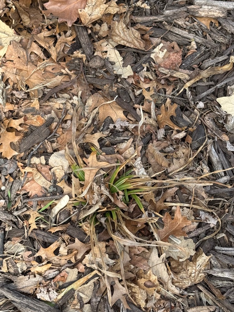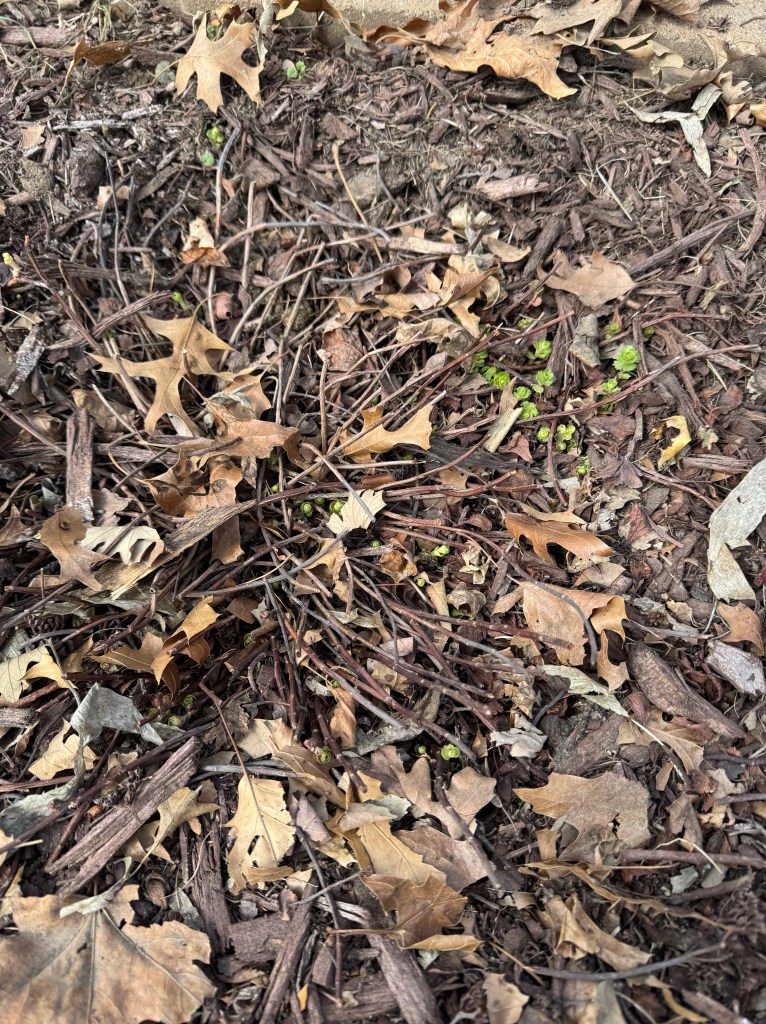 The new garden “look” includes continuing to transplant the Blue Mouse Ears hostas. I dug, divided, and transplanted a large clump of those hostas into their new spots, and I really like it. If there is time, I have one more clump of Blue Mouse Ears to move, but if I don’t, it can stay as is until next year. I also am seeing some purple shamrocks come up from this spring’s, shall we say, squirrel curiosity, ahem.