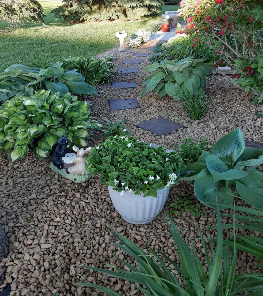 This past weekend I finally felt comfortable putting the shamrock plants out. The are kind of a fixture in the summer garden. The purple one especially draws the eye all the way to the end of the linden garden area.
