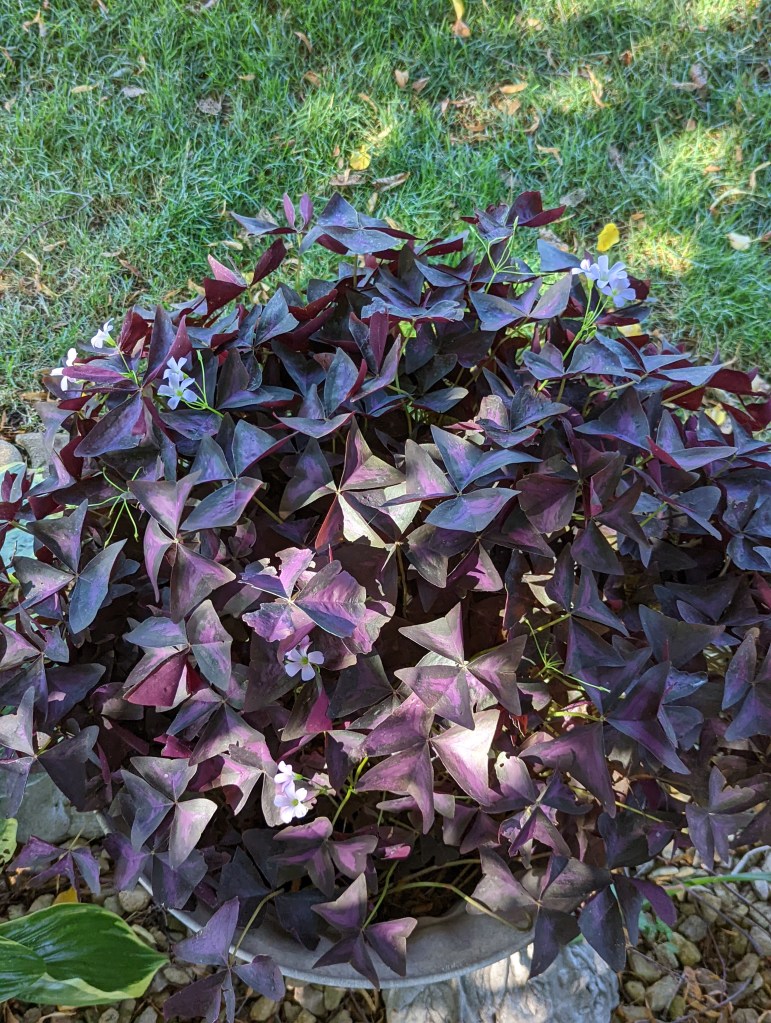 We have two fairly good-sized shamrock plants in pots here. Most summers they can be seen in the area under the linden. One is purple and one is green.